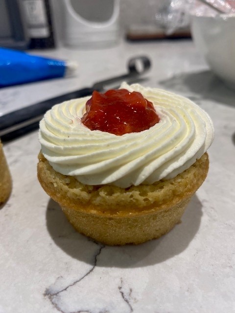 - Level the cakes if needed, i use an apple core to take the centre of the cake out. Fill with the Compote, pipe the whipped cream on, i went in a circular motion with a closed star nozzle, then fill with more compote.